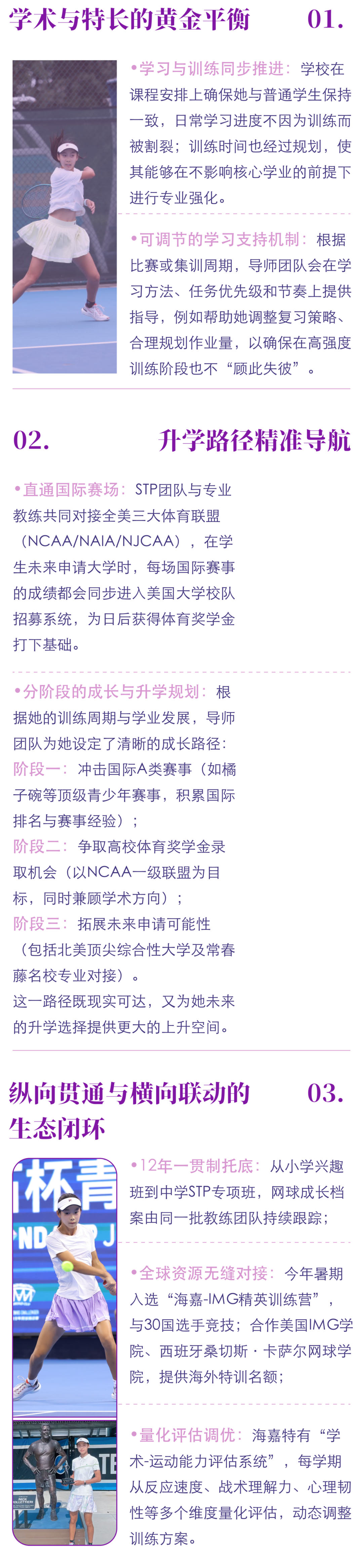 Posy Zou的“不败神话”并非偶然,背后是海嘉STP双优计划的深度赋能。这不是简单的特长培养,而是“学术筑基+特长精进+升学护航”三位一体的闭环体系,为她量身定制成长轨道: